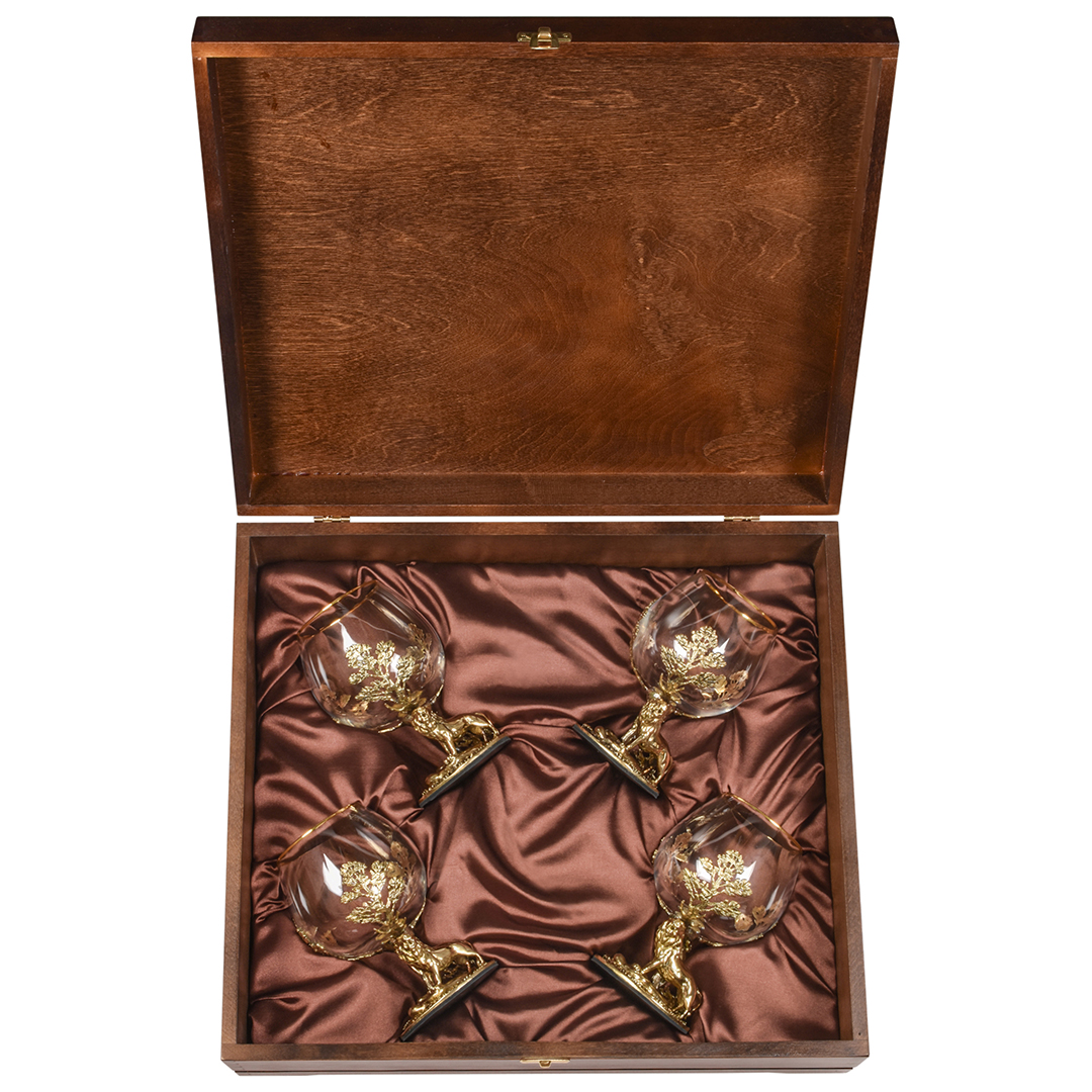 Набор 4 бокала для коньяка "Лев", в шкатулке из массива дерева