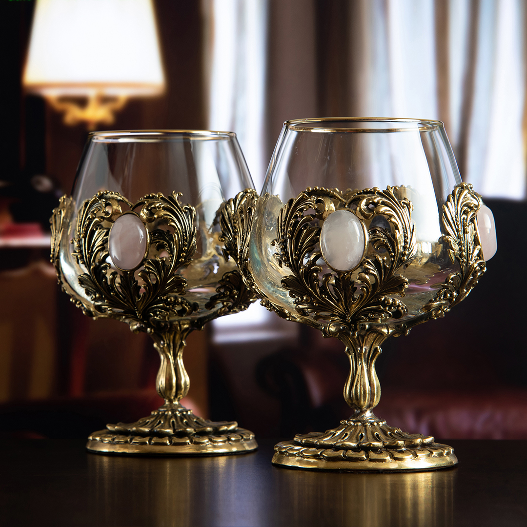 Набор 2 бокала для коньяка с камнем "Кошачий глаз" и "Сердолик", в шкатулке из массива