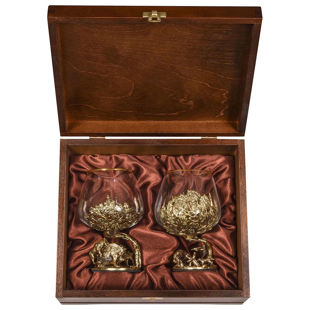 Набор 2 бокала для коньяка "Охота на Вепря" и "Охота на Кабана", в шкатулке из массива