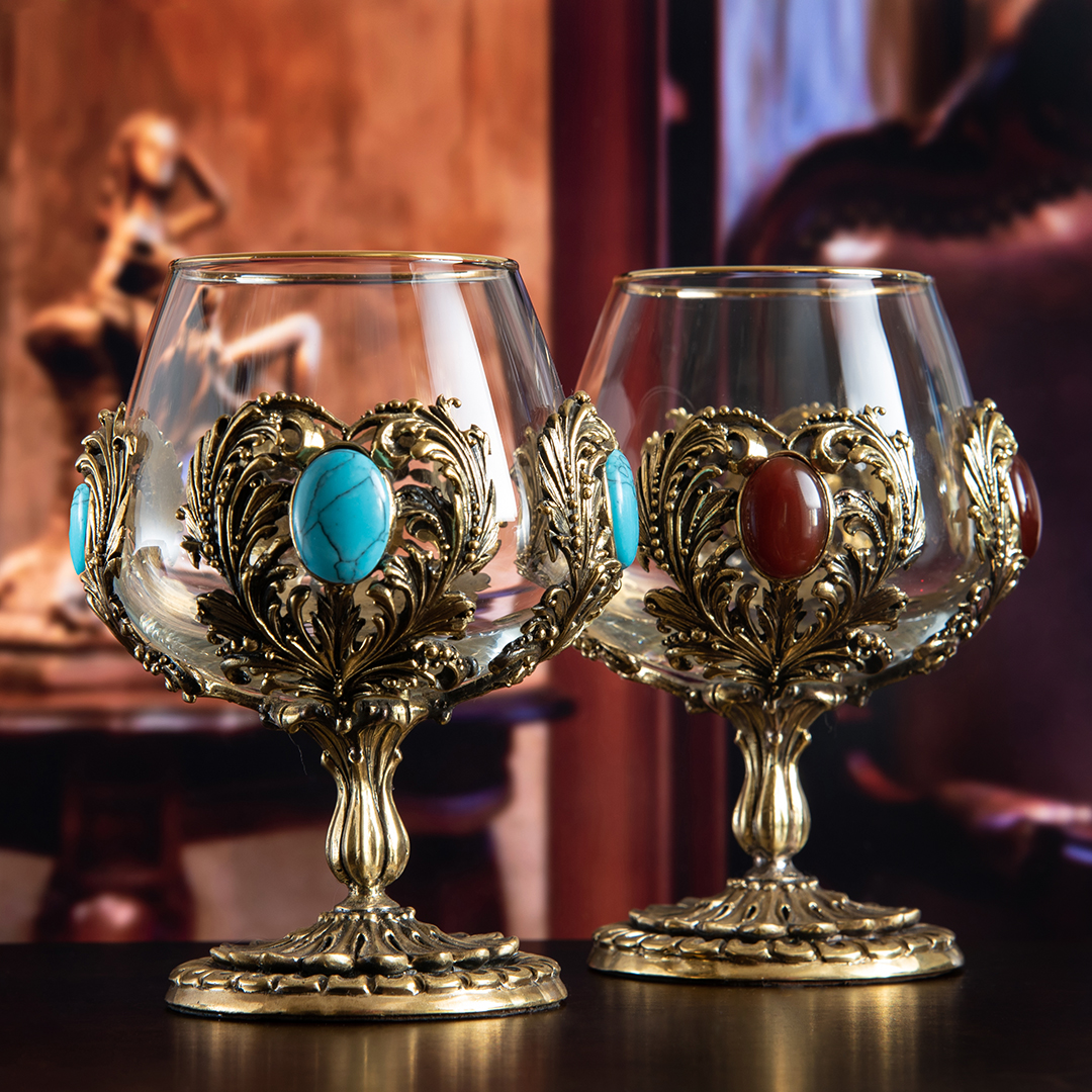 Набор 2 бокала для коньяка с камнем "Бирюза" и "Сердолик", в шкатулке из массива