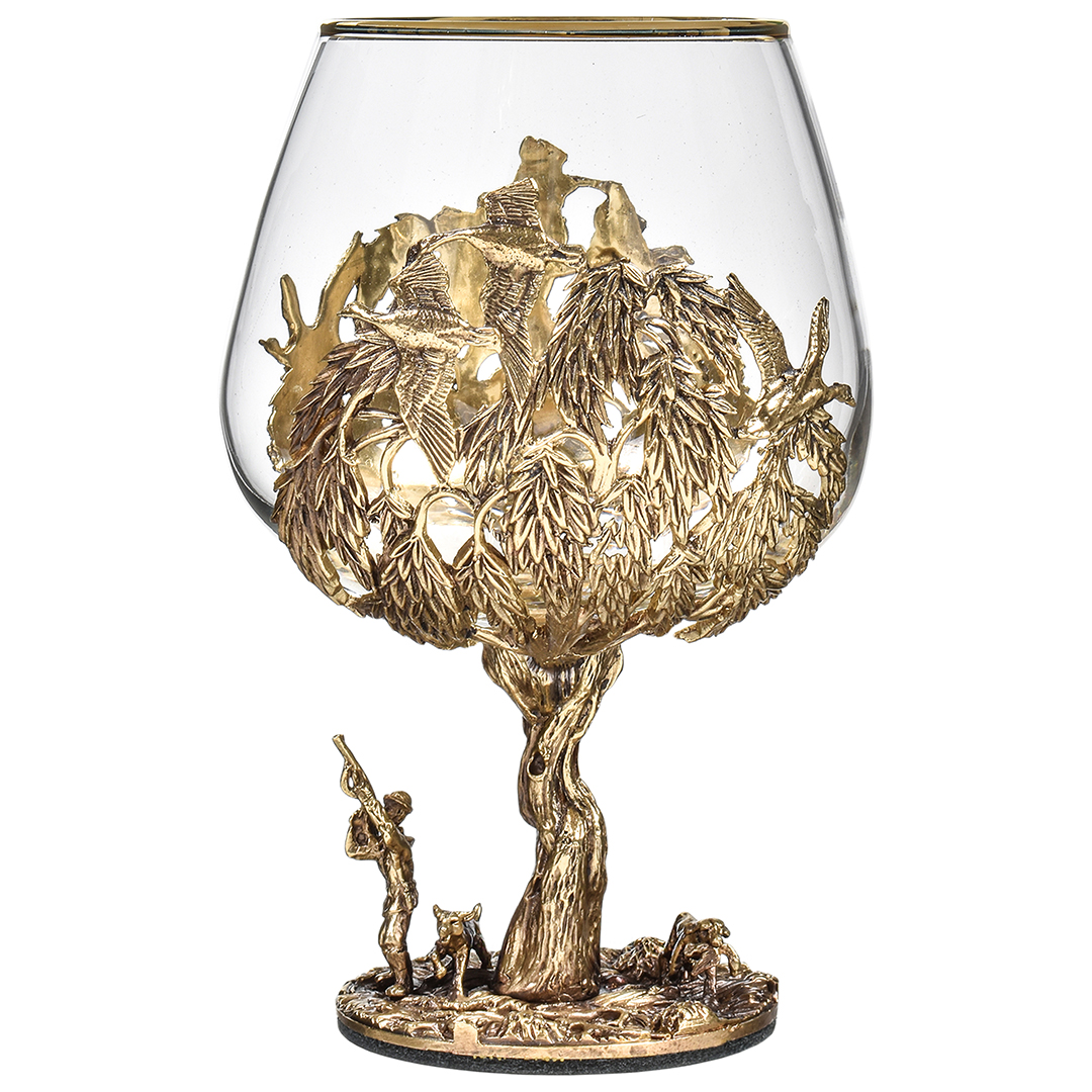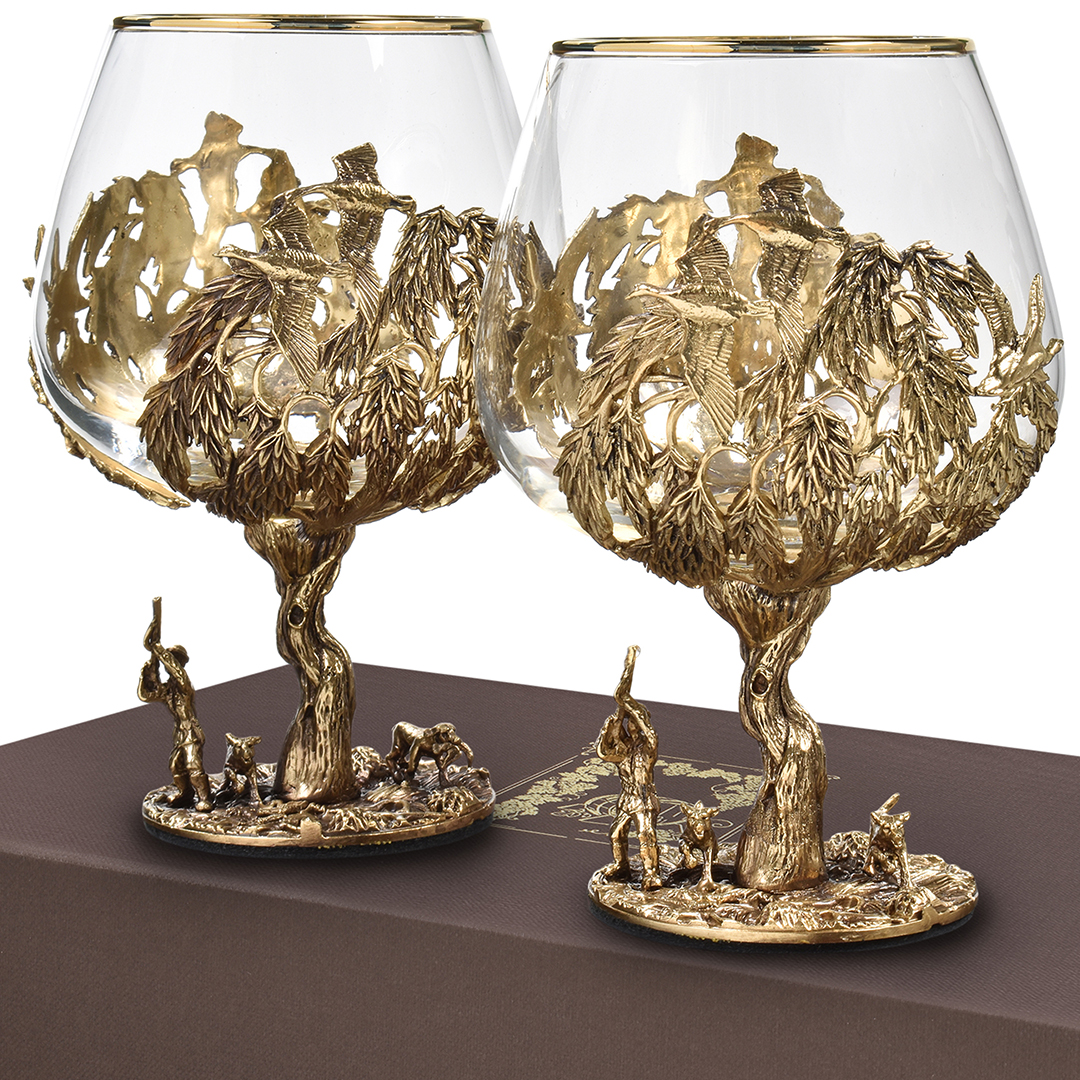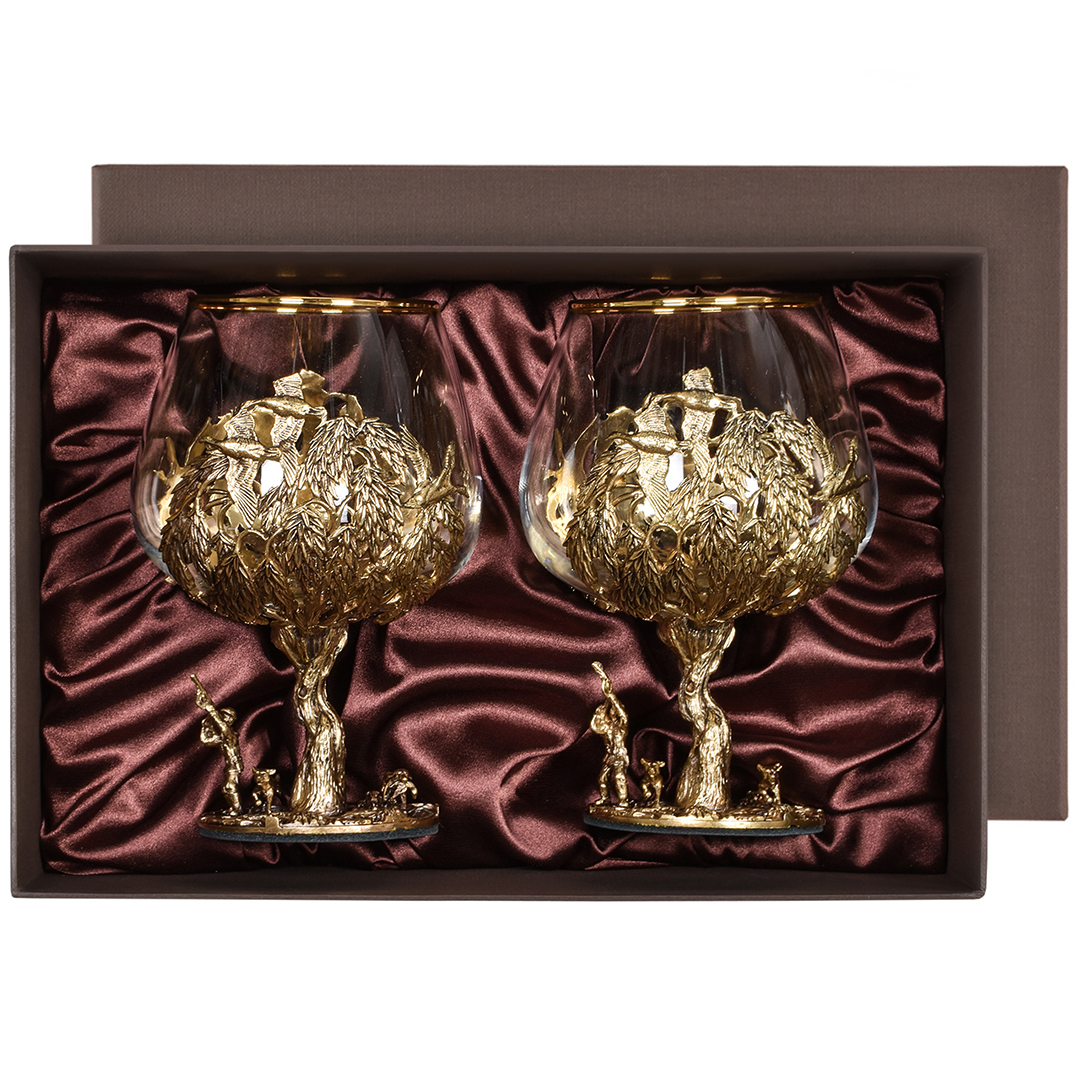 Набор включает 2 бокала для коньяка с латунным основанием "Охота на Уток" и "Охота на Лося" в черной коробке из дизайнерского картона.В отличие от многих других товаров на рынке, эти бокалы изготовлены исключительно из российских материалов, что придает им уникальность и исключительность.