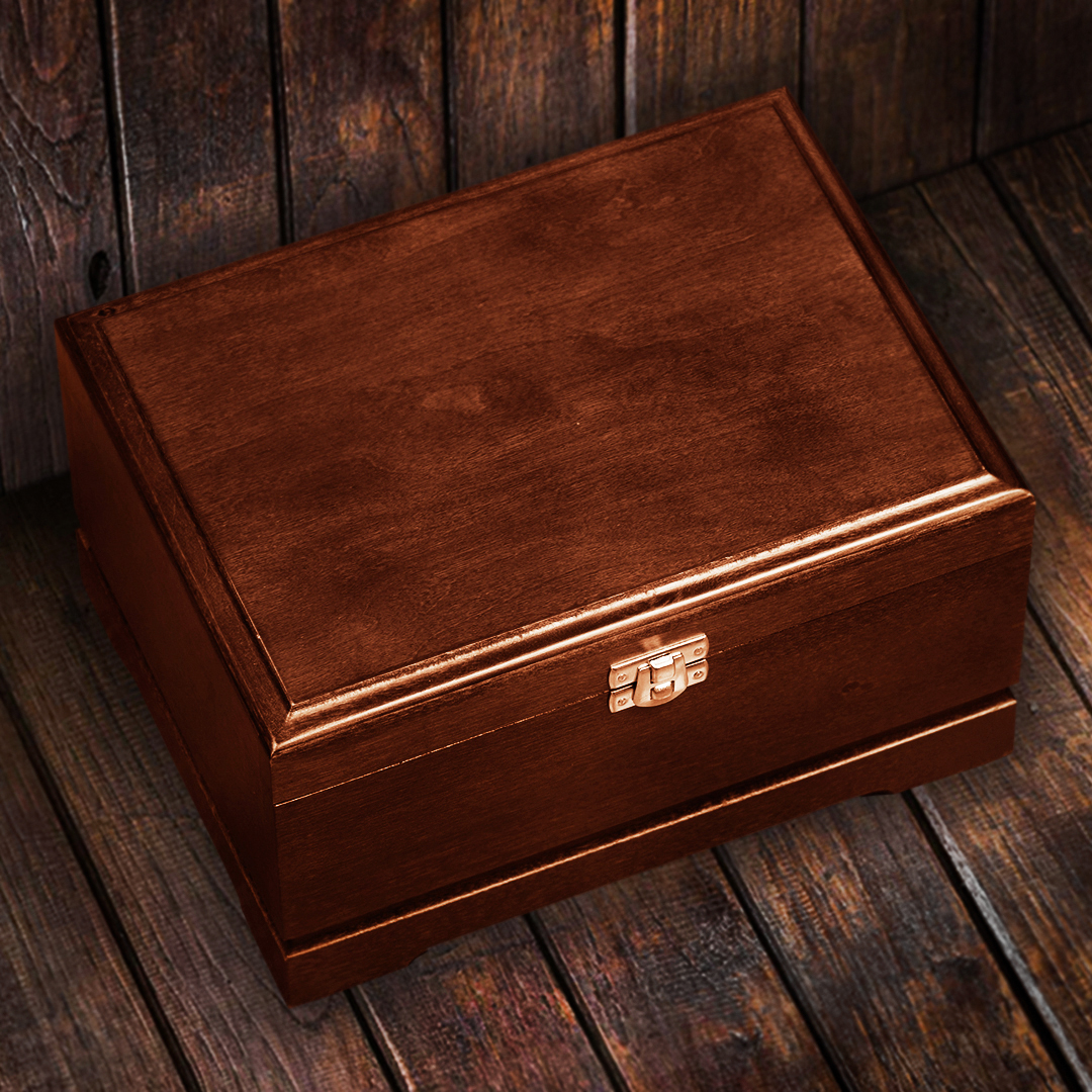 Шкатулка из массива не только обеспечивает дополнительную защиту бокалов от внешних воздействий, но и придаёт всему изделию особую презентабельность.