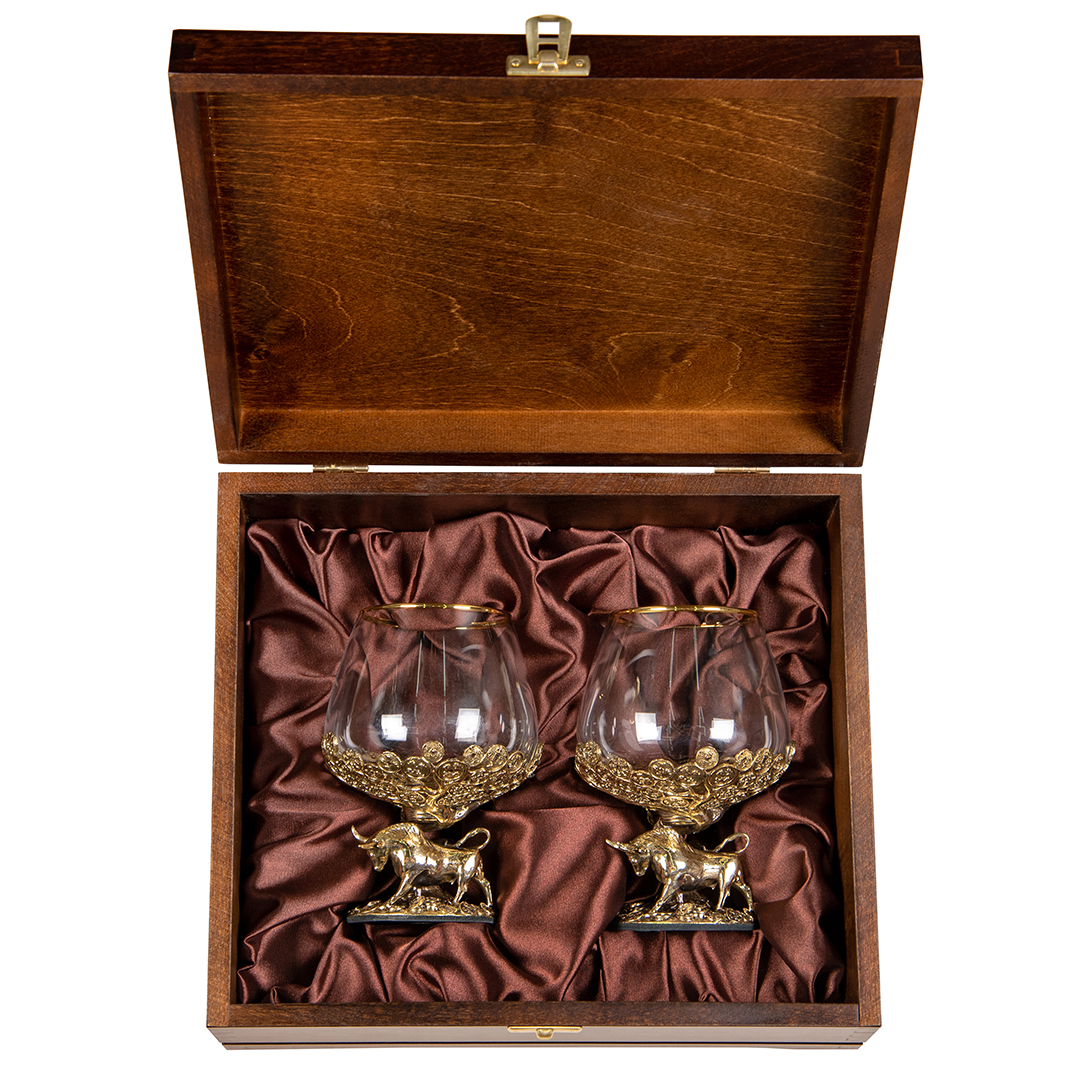 Набор из двух бокалов для коньяка Денежный Бык 310 мл в деревянной шкатулке
