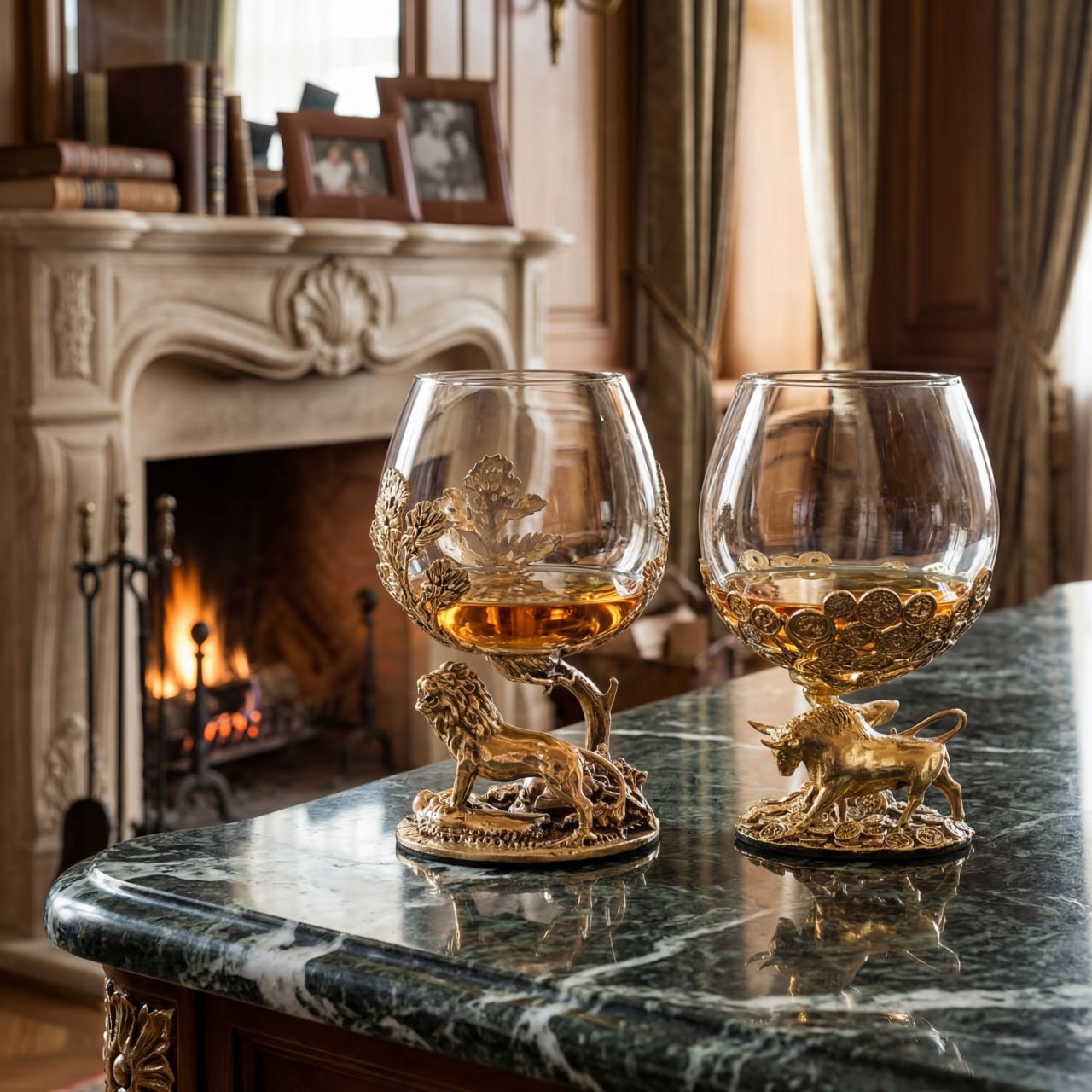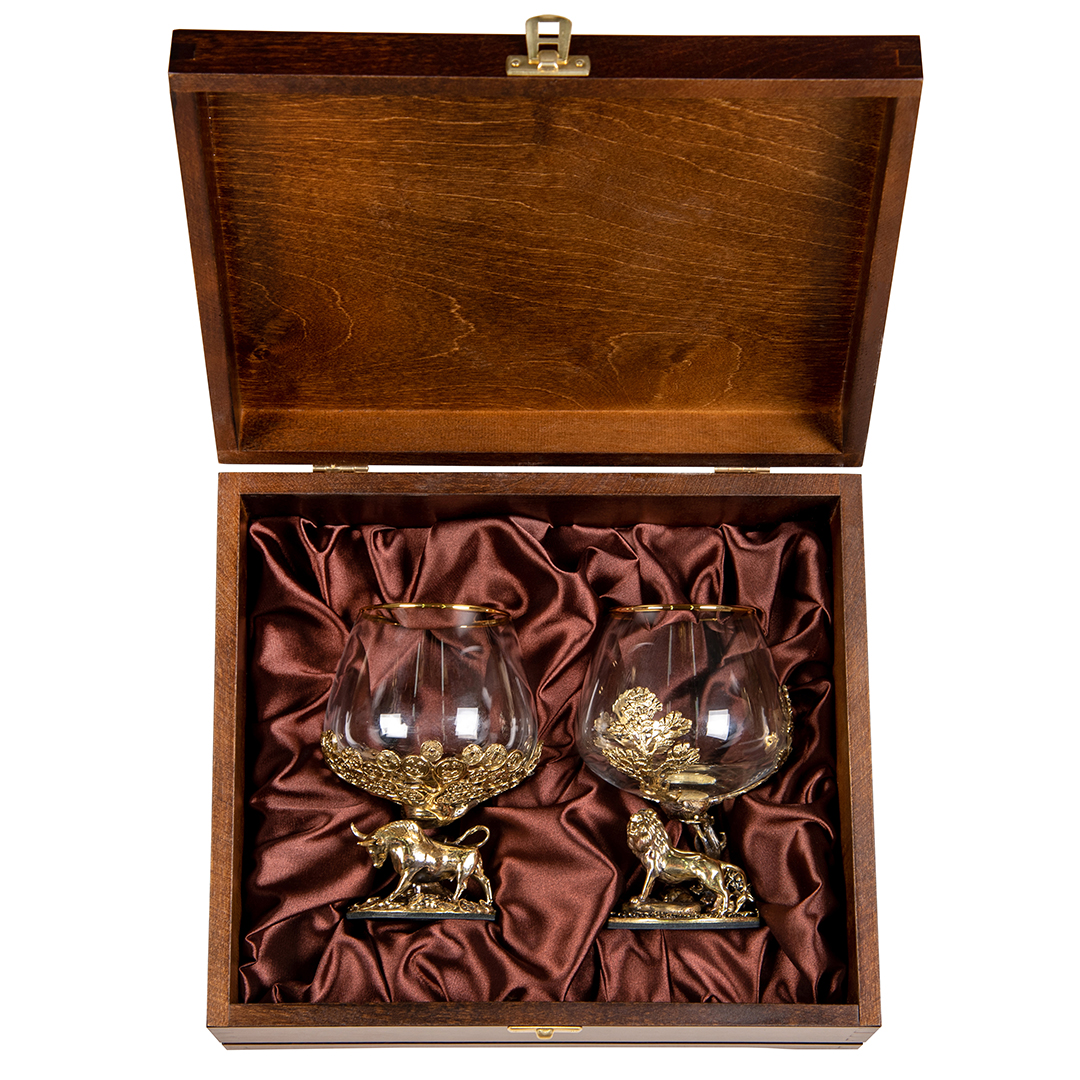 Набор из двух бокалов для коньяка Денежный Бык и Лев 310 мл в деревянной шкатулке