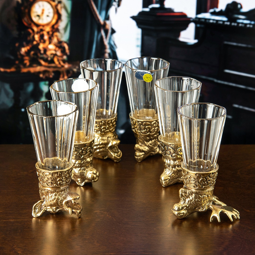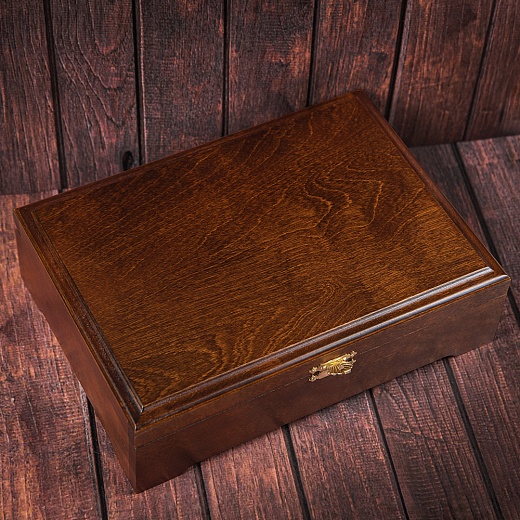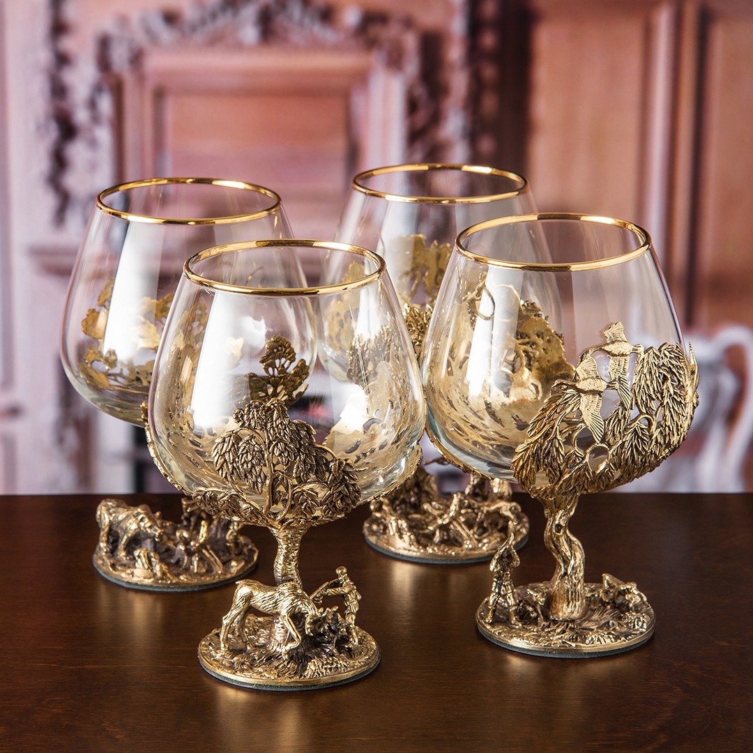 Набор из 4 -х бокалов для коньяка Охота и 6-ти стопок перевертышей в деревянной шкатулке