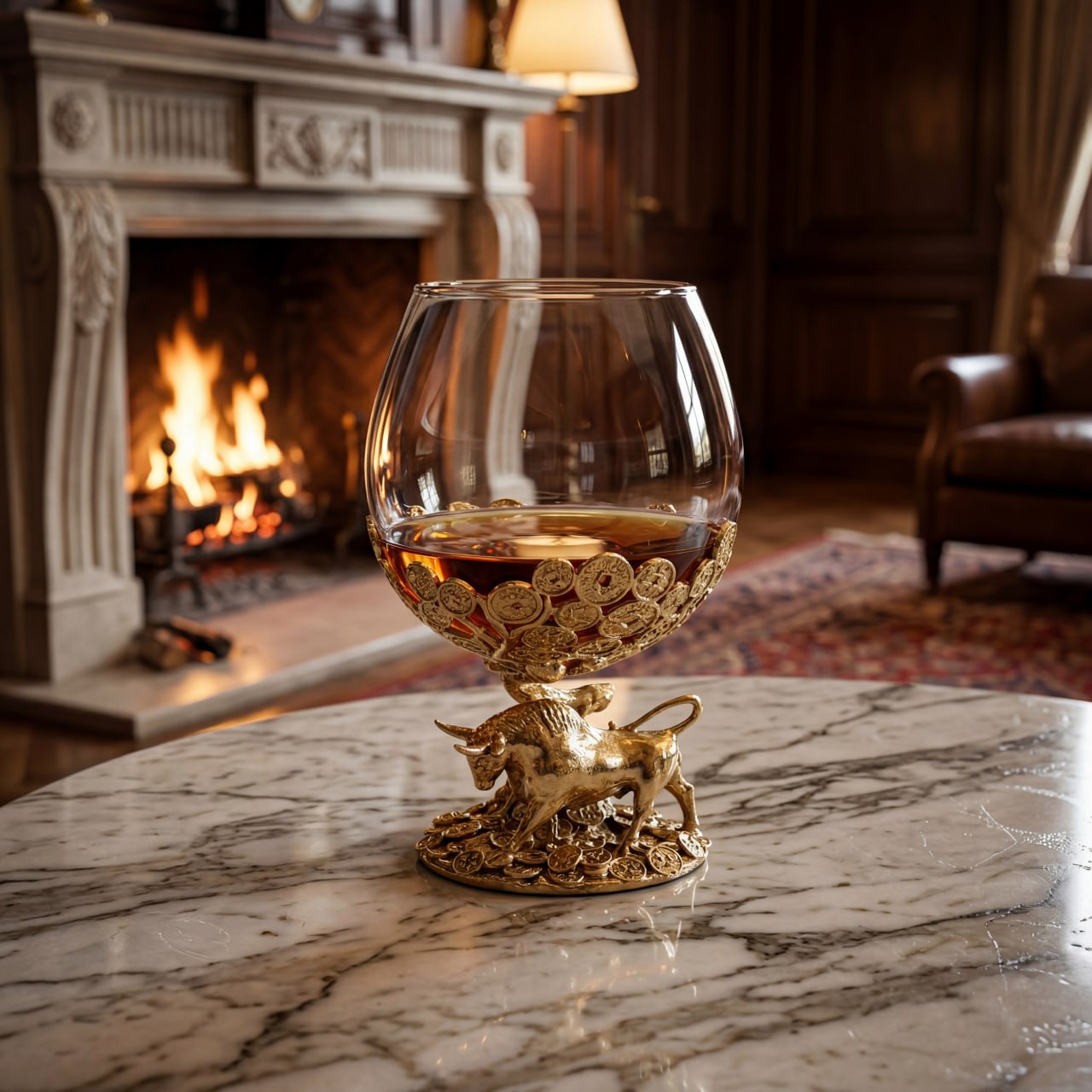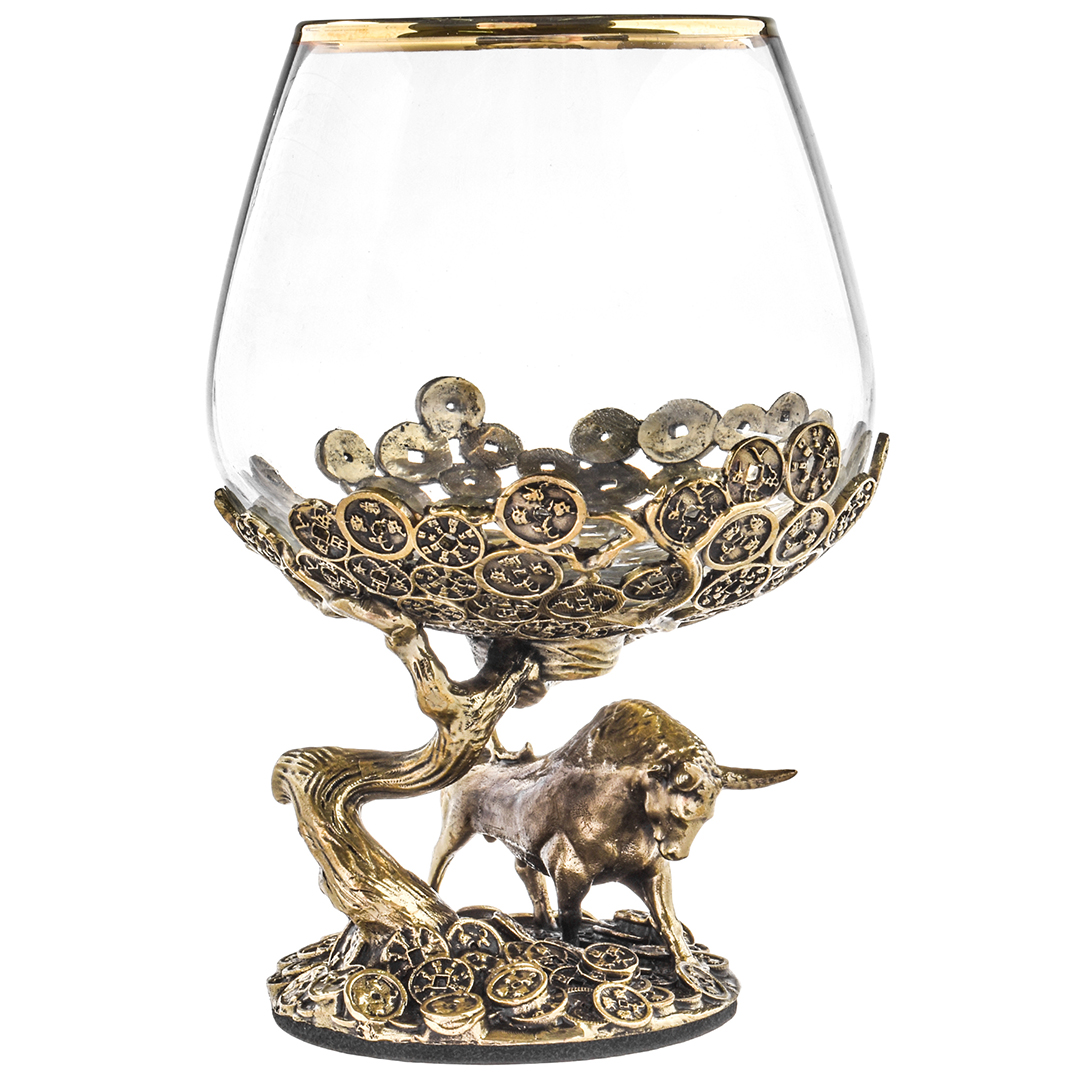 Бокал для коньяка ручной работы "Денежный Бык" 310 мл в деревянной шкатулке