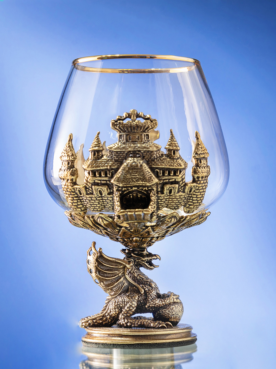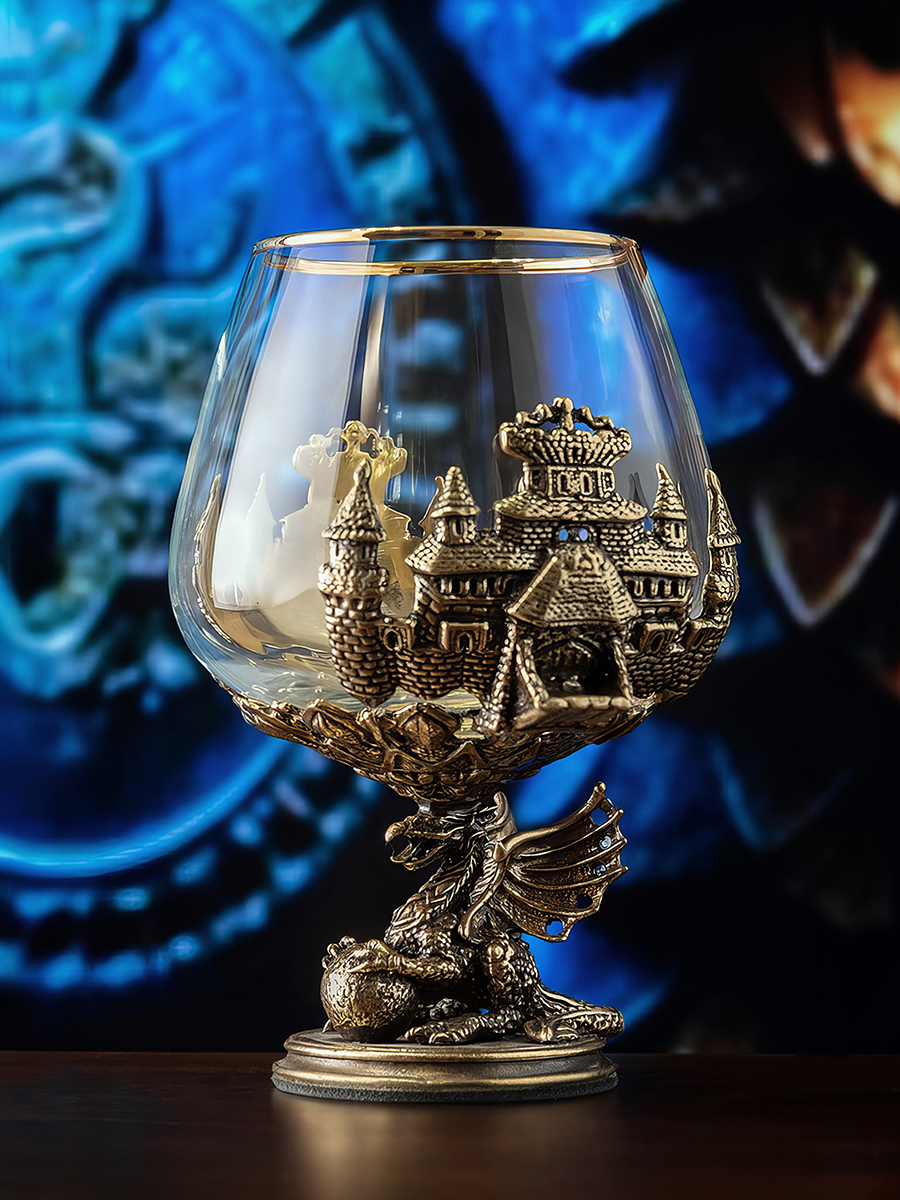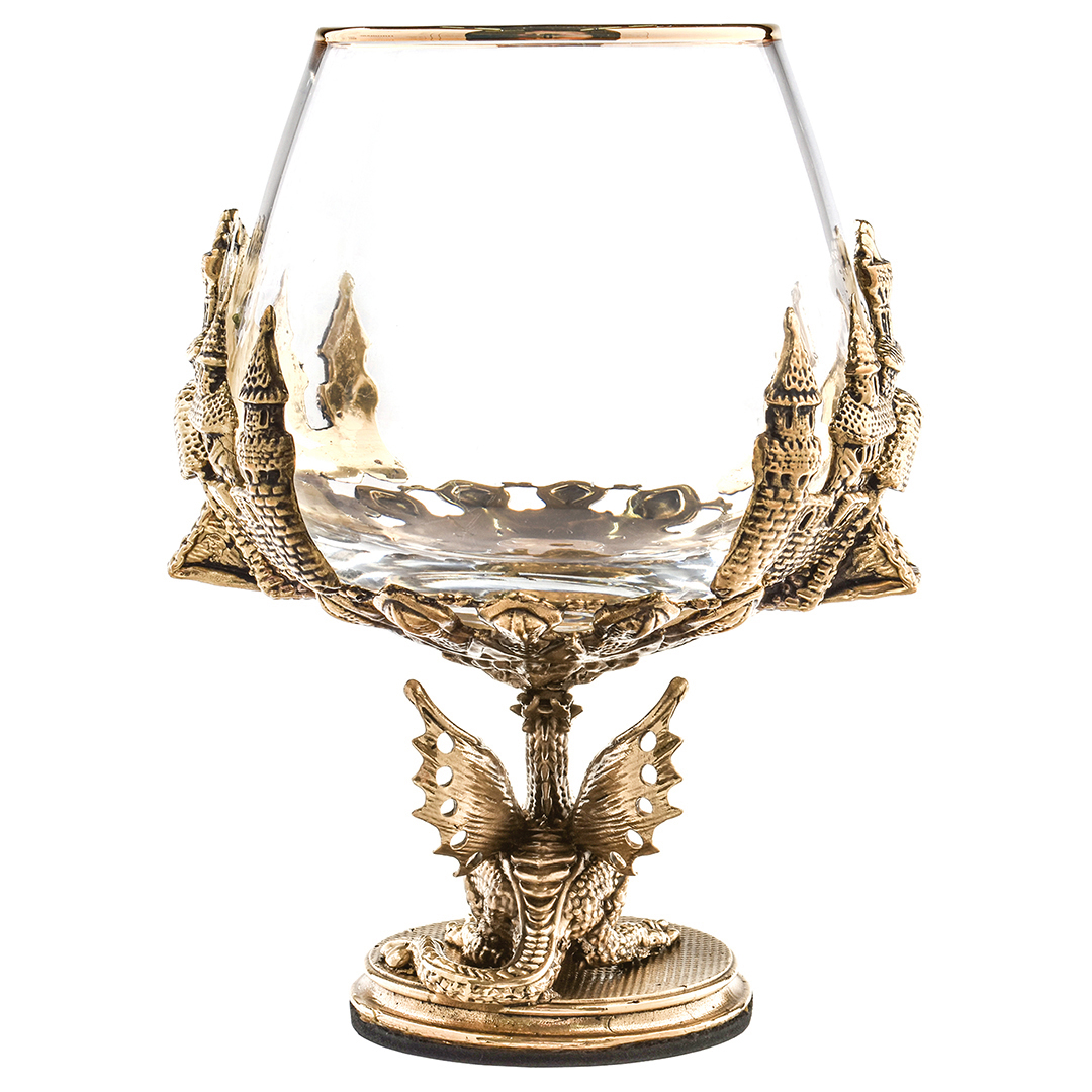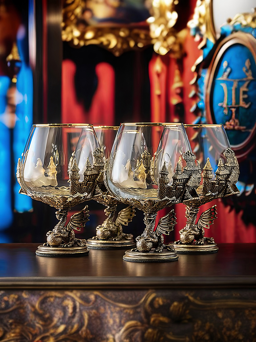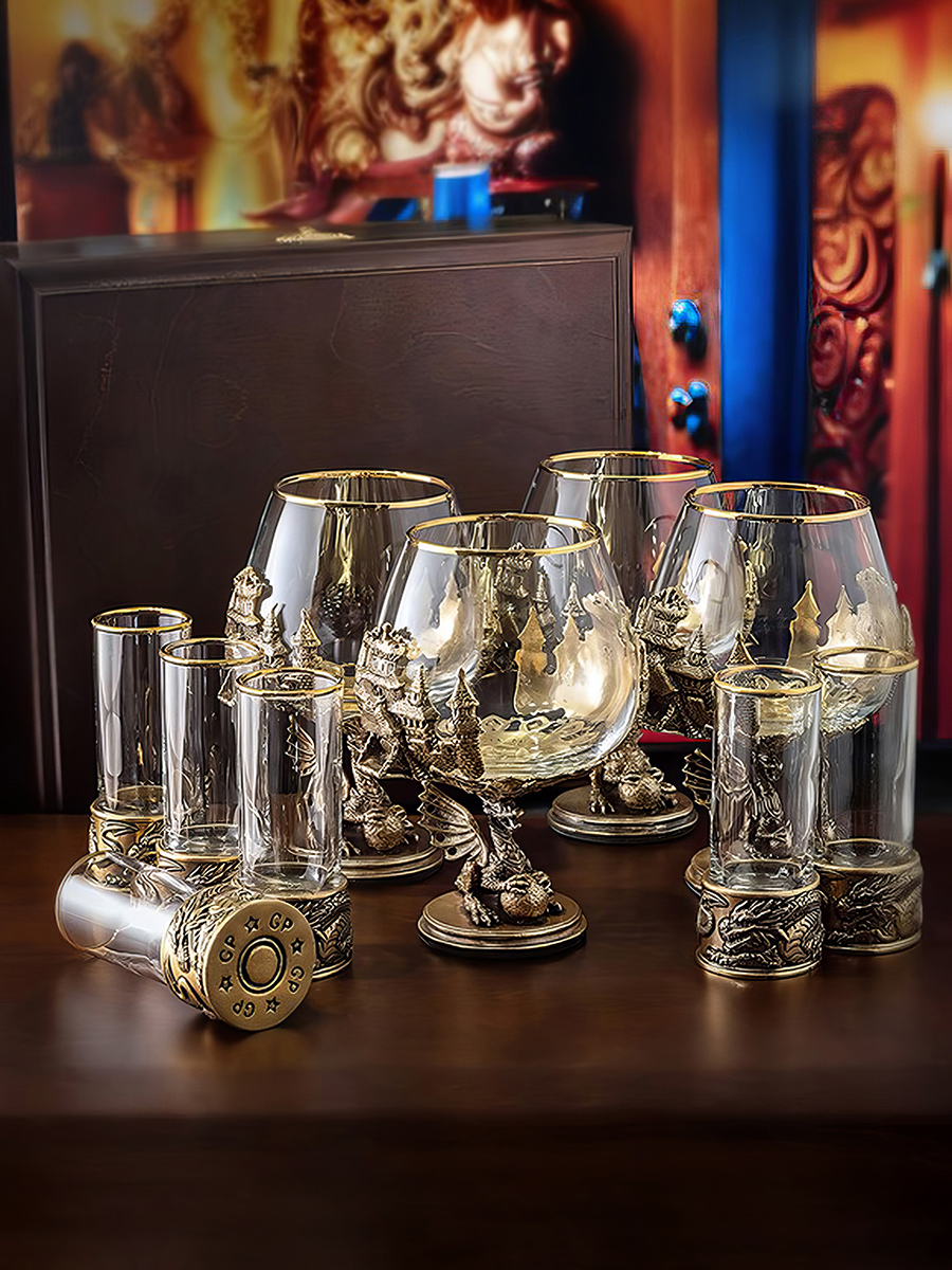 Набор 4 бокала для коньяка (Р) "Дракон на шаре",6 стопок патрон "Дракон", в деревянной шкатулке.