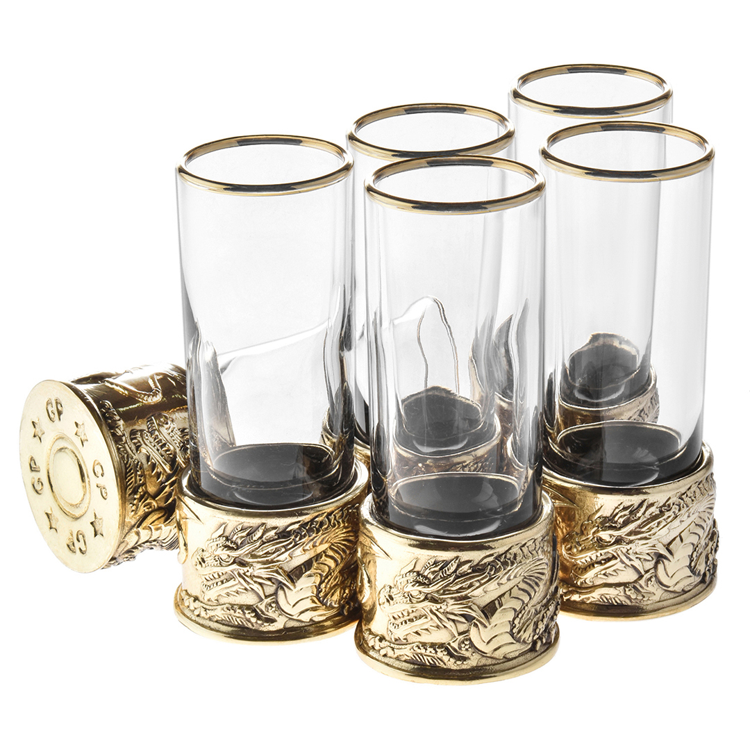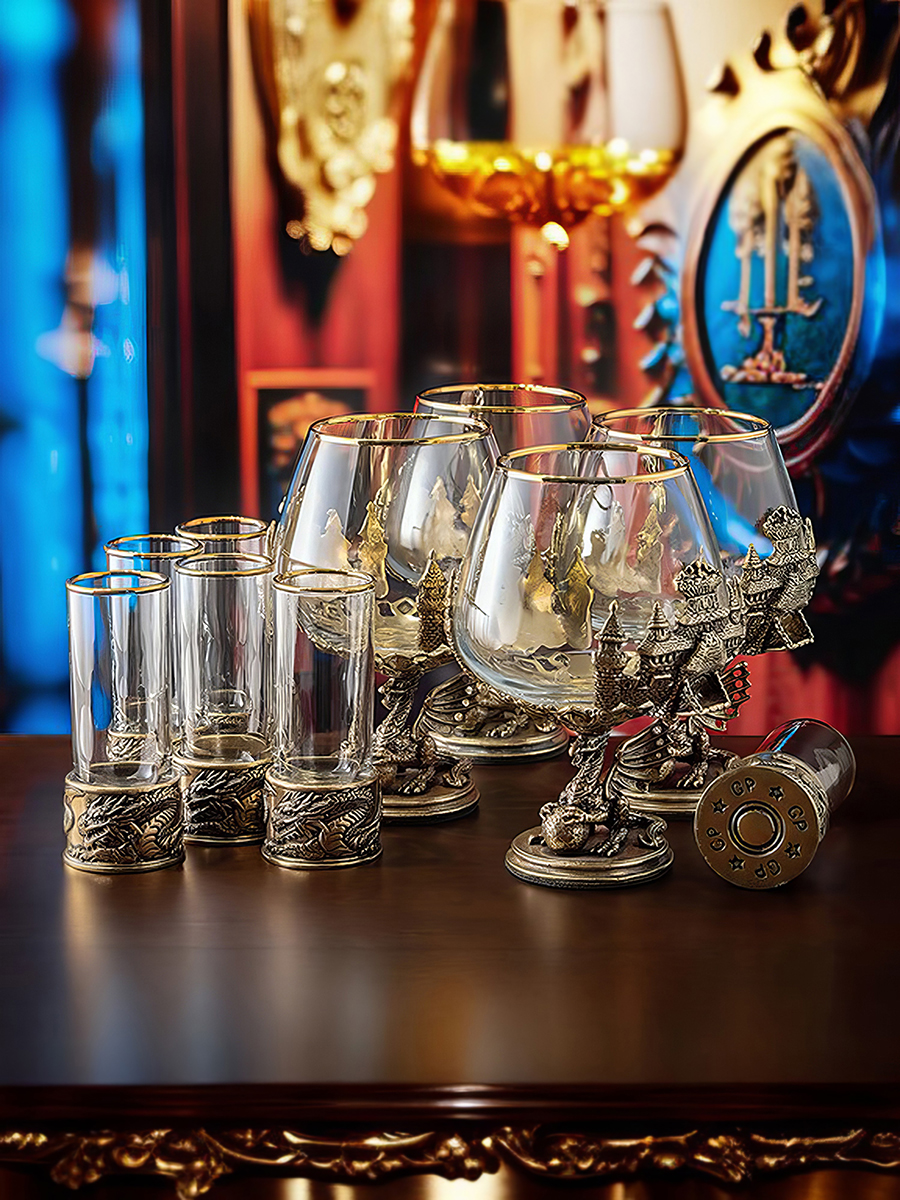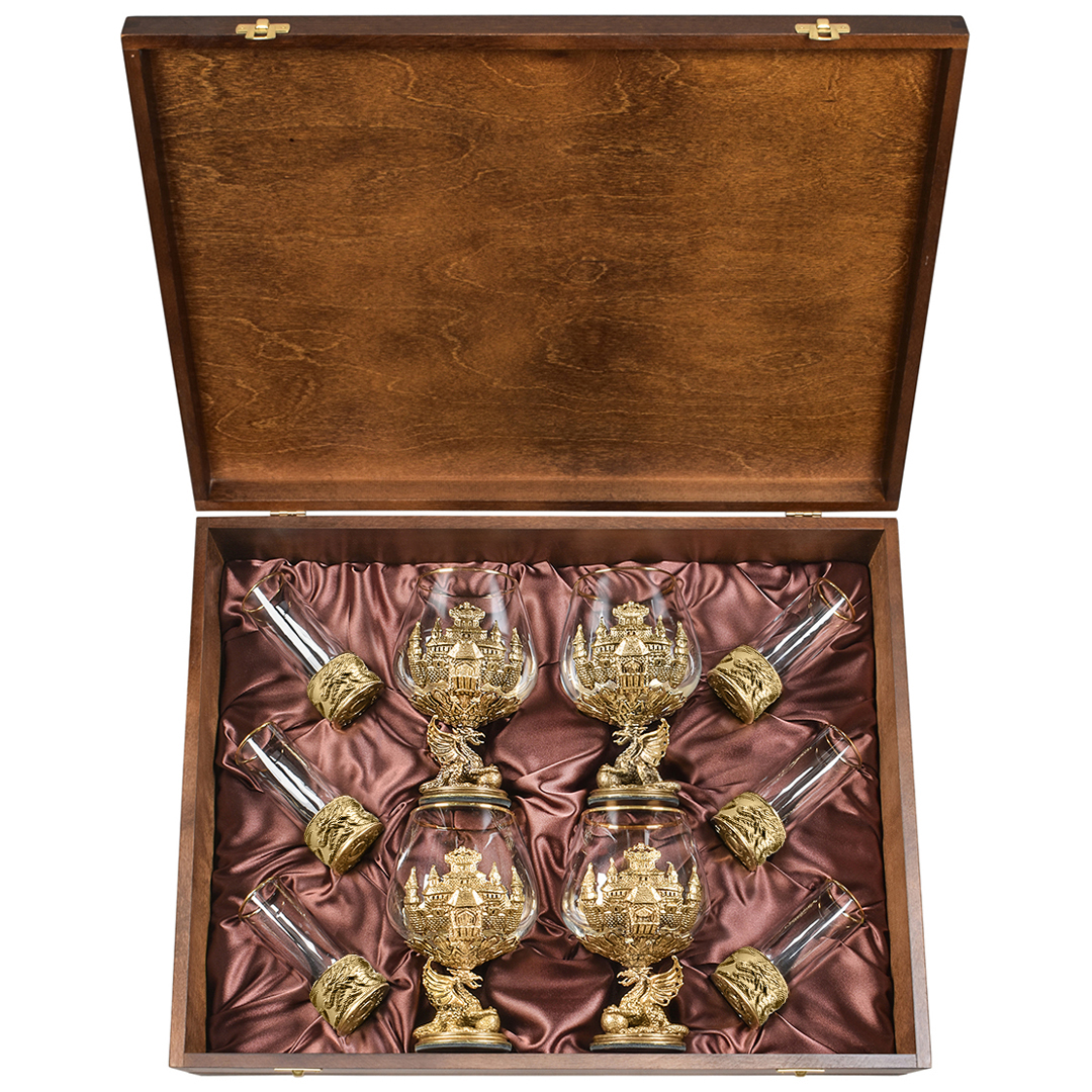 В наборе 4 бокала для коньяка + 6 стопок патрон в деревянной шкатулке |