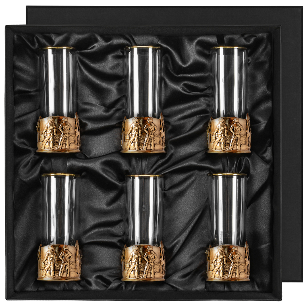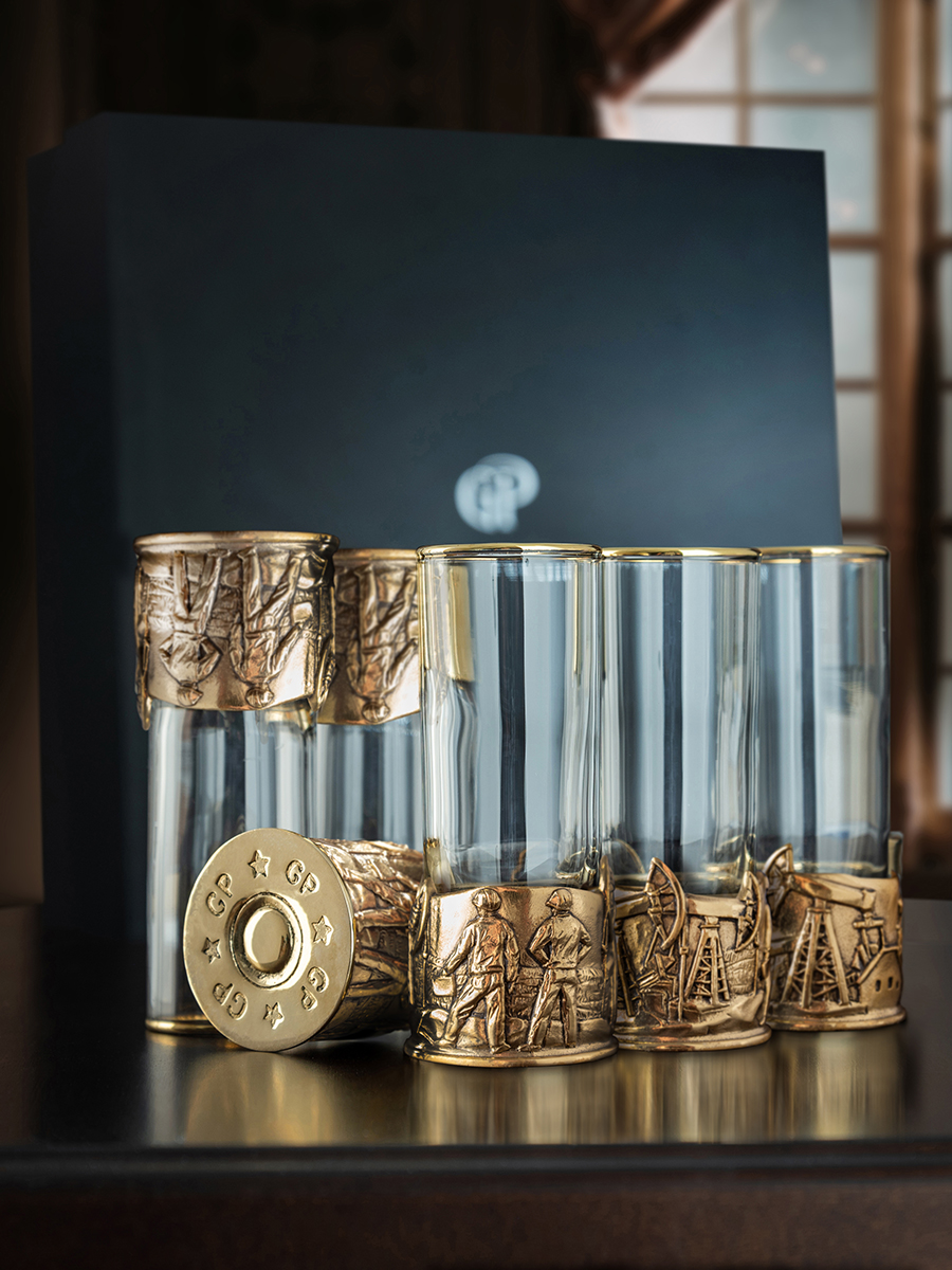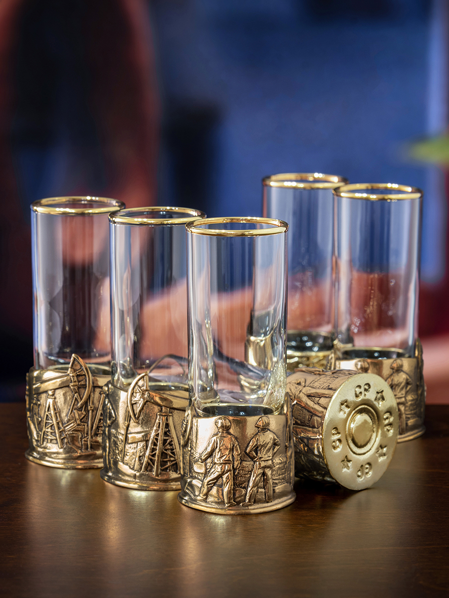 Приветствуем вас в мире превосходных подарков! Представляем вашему вниманию набор из шести уникальных стопок, выполненных в стиле патрон. Их дизайн вдохновлен мужественной и сложной профессией нефтяника, идеально подчеркивая дух настоящих профессионалов. Каждая деталь этого набора создана с особой тщательностью и вниманием к качеству.Эти стильные изделия станут прекрасным дополнением любого праздника, в особенности когда вы чествуете профессиональные достижения. В основе их производства используются проверенные российские материалы, что гарантирует долговечность и надежность каждого элемента. Стопки оснащены латунным основанием, придающим каждому изделию изысканный и солидный вид.