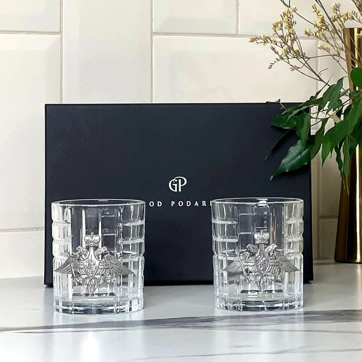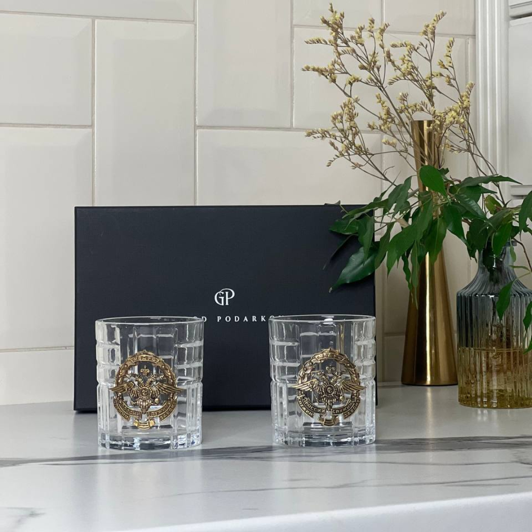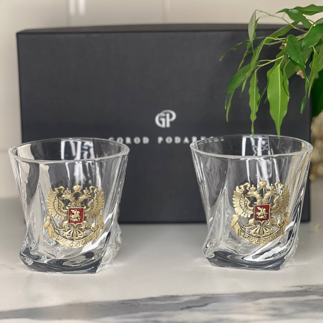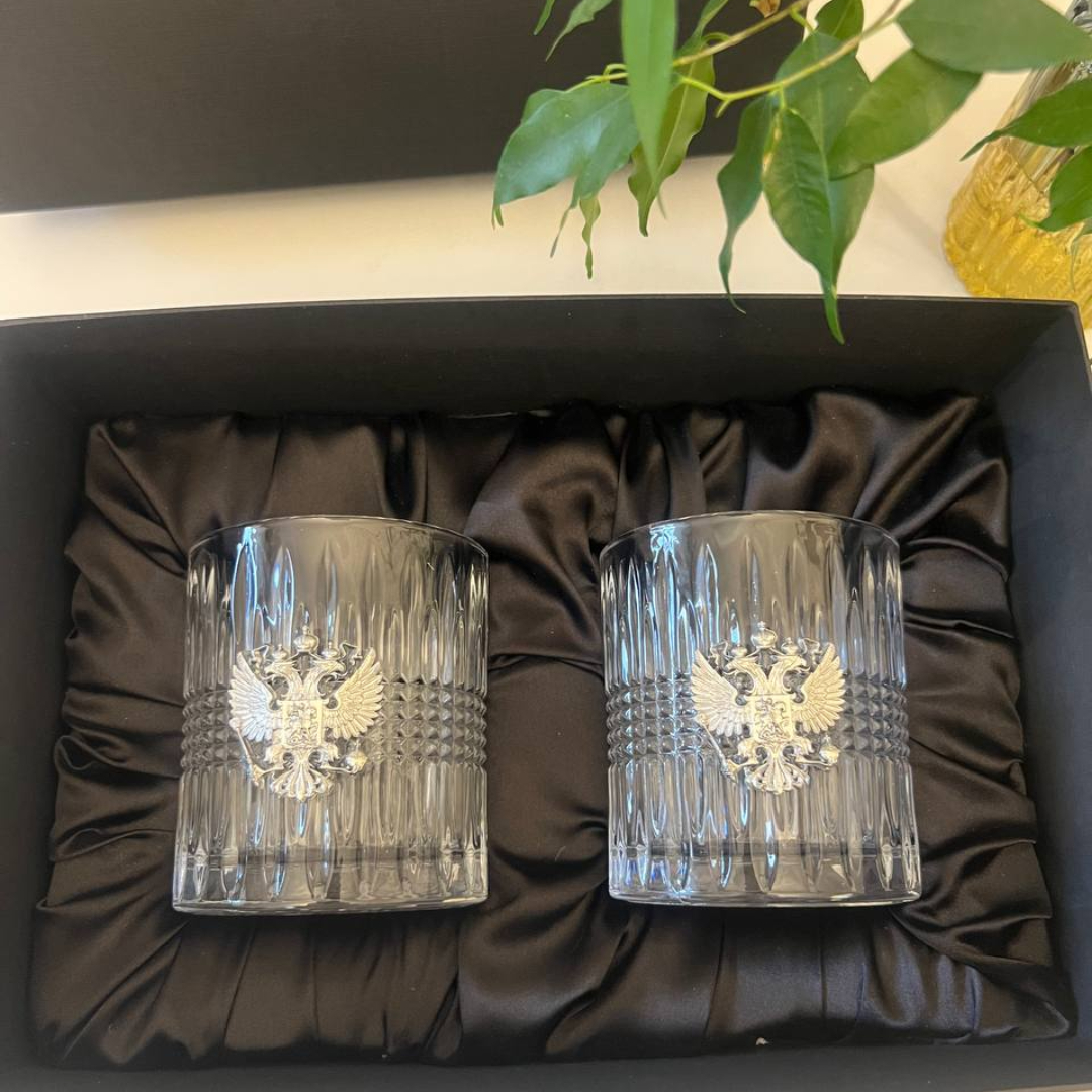Набор из 2-х бокалов для виски с накладками Герб РФ в черной подарочной коробке