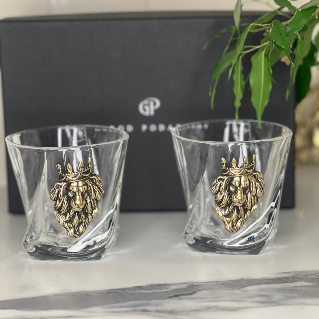 Набор из 2-х бокалов для виски с накладками Лев в короне в черной коробке