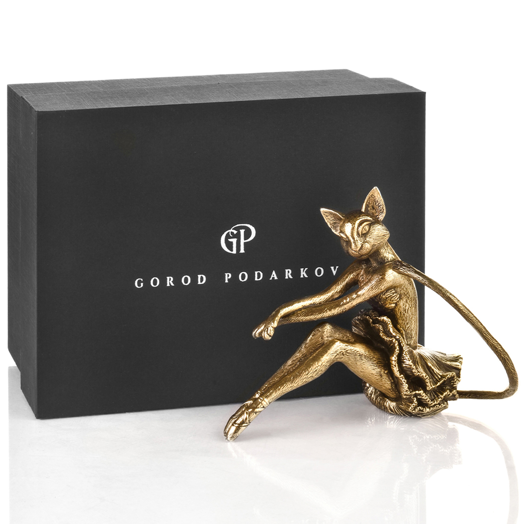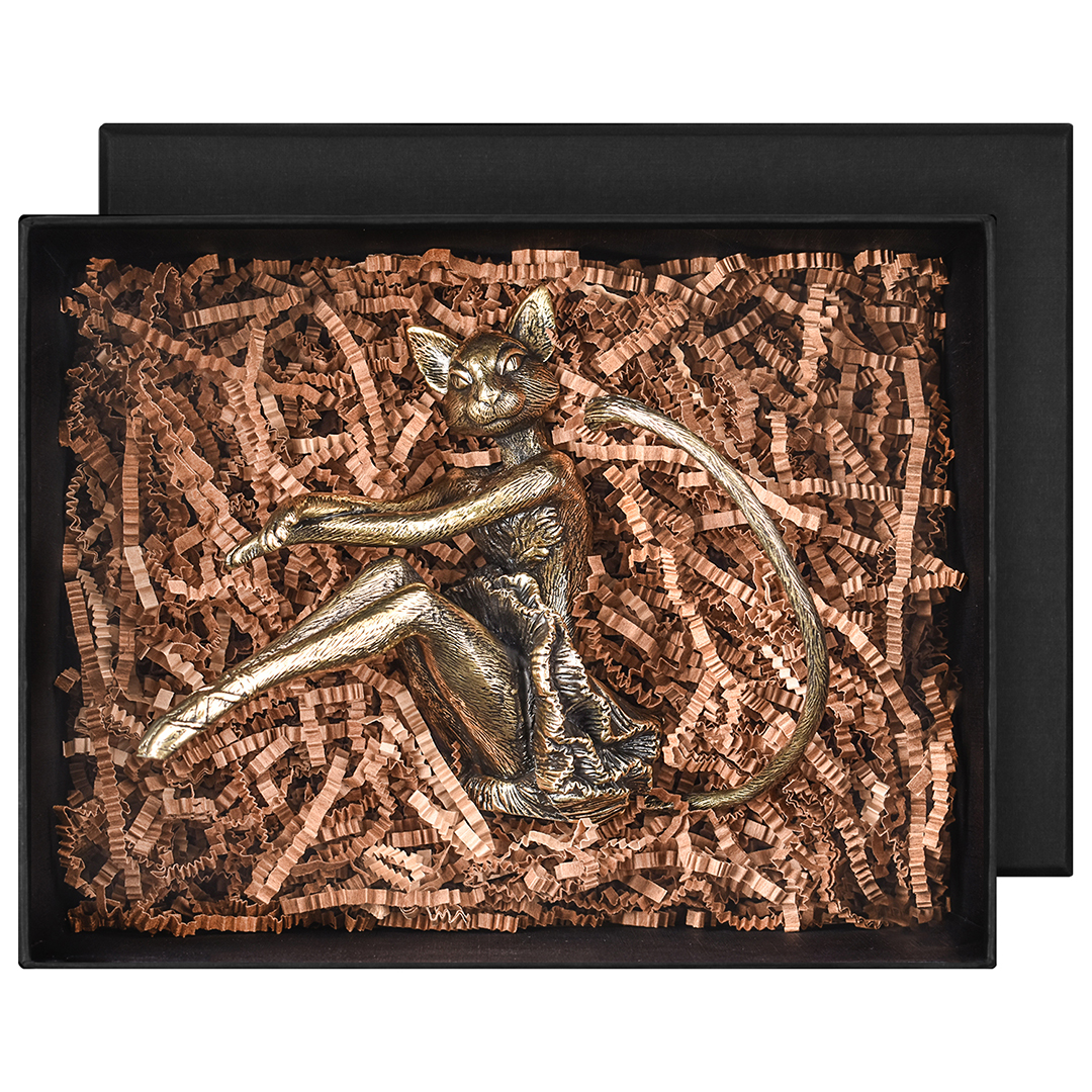 В наборе статуэтка Кошка из латуни в подарочной черной картонной коробке с крафтом.