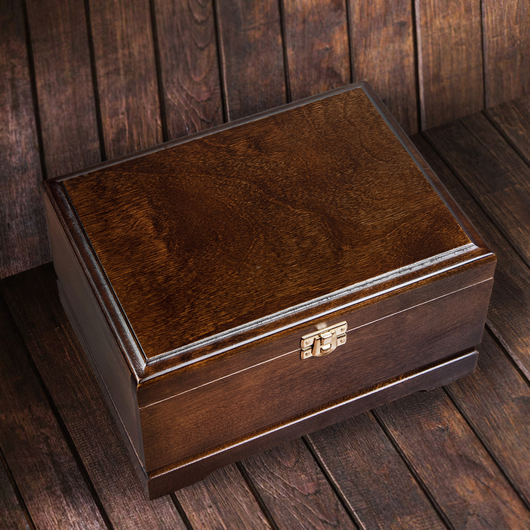 В наборе 1 бокал для коньяка. Упаковка - деревянная шкатулка из массива с шёлковым коричневым ложементом. |