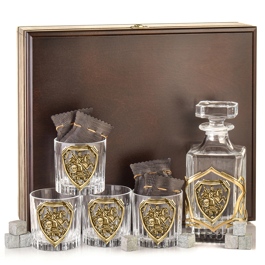 Набор 4 бокала для виски со Штофом накладка "Георгий Победоносец", в шкатулке из массива