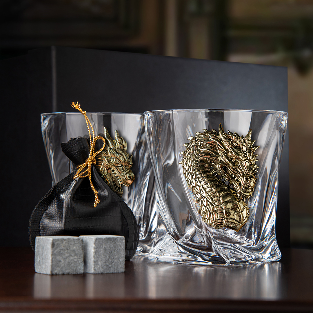 Набор бокалов для виски Квадро ( 2 шт.) с накладкой "Лев и Львица Царские"  в подарочной коробке