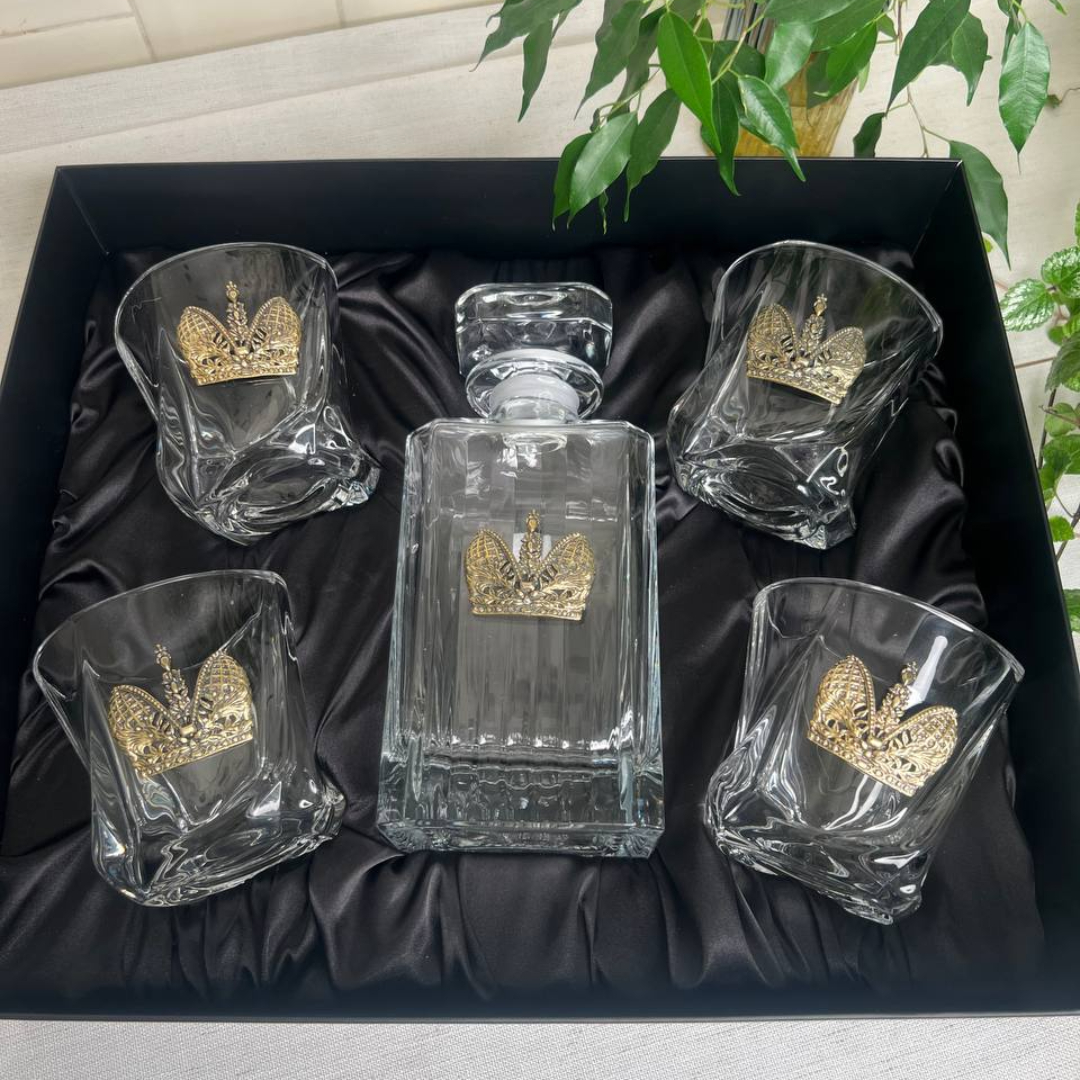 Набор со штофом Корона: Штоф Таймлесс, 4 бокала для виски с накладками в черной коробке