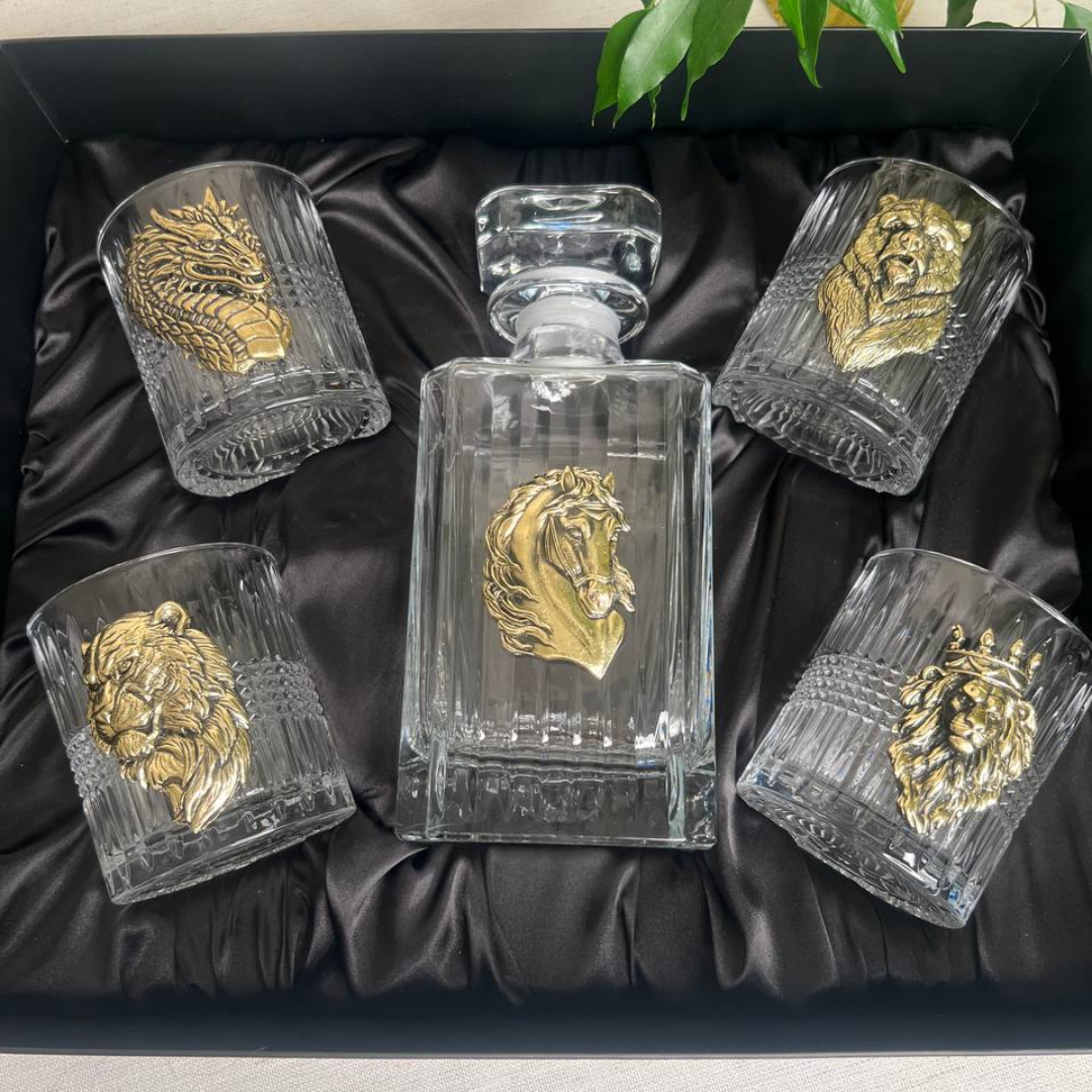 Набор со штофом Новогодний 2: Штоф Таймлесс с накл. Лошадь, 4 бокала для виски с накладками Дракон, Медведь, Волк, Лев с короной в черной коробке