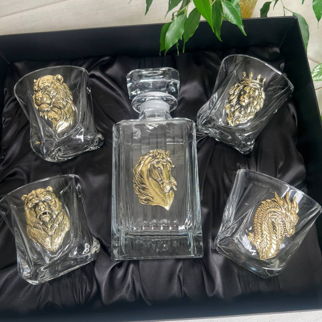 Набор со штофом Новогодний: Штоф Таймлесс с накл. Лошадь, 4 бокала для виски с накладками Дракон, Медведь, Волк, Лев с короной в черной коробке