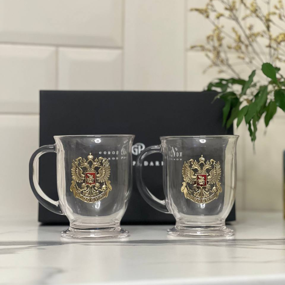 Набор для глинтвейна: 2 чашки с накладками Герб РФ с эмалью в черной коробке