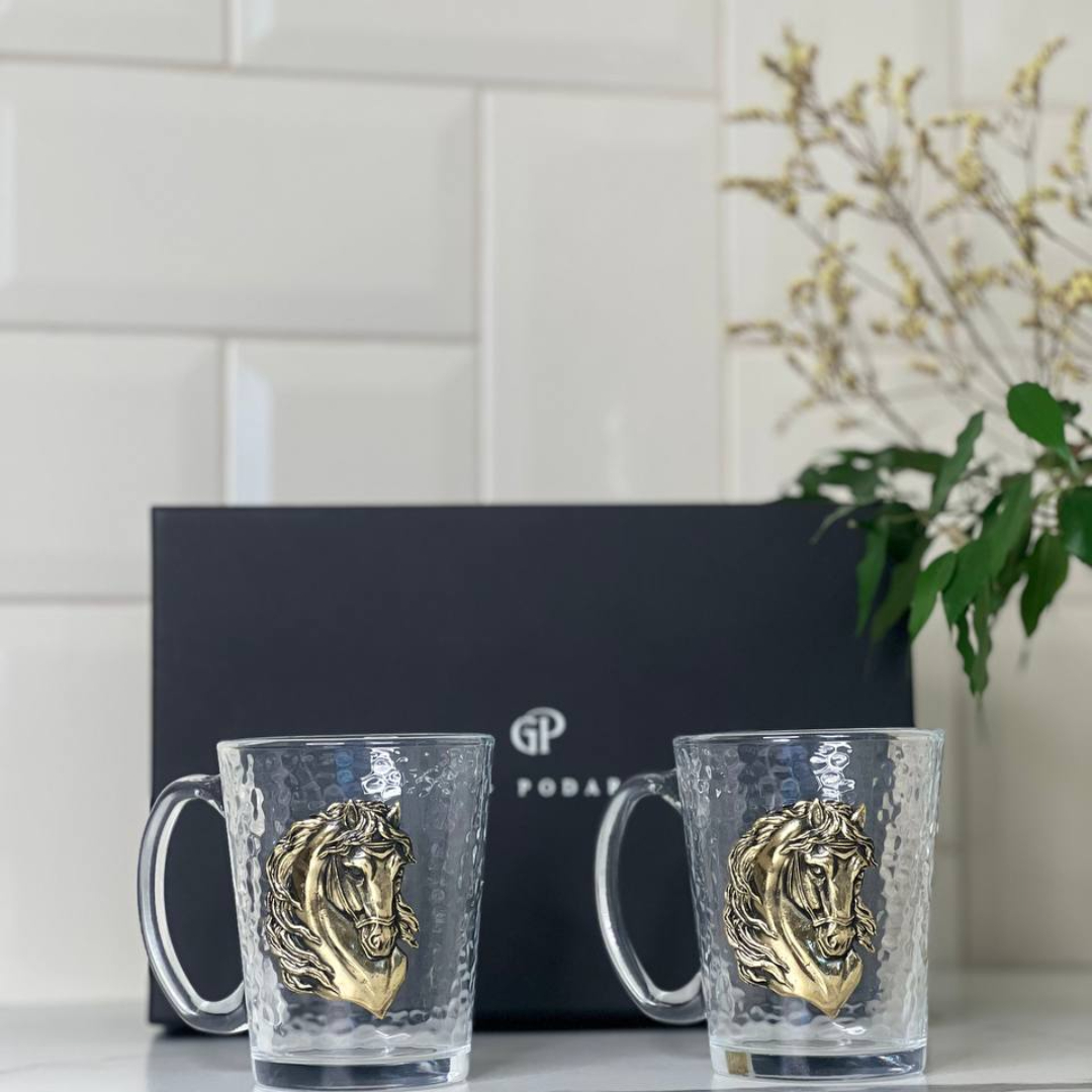 Набор из 2-х стеклянных кружек с накладками Лошадь в черной подарочной коробке
