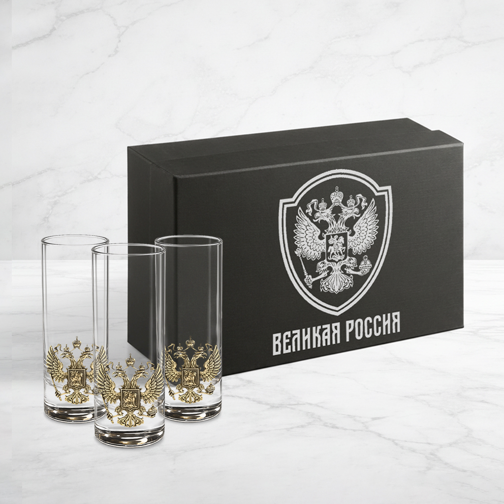Набор из 3-х стопок Сиде с накладками Герб РФ в черной подарочной коробке с печатью Великая Россия