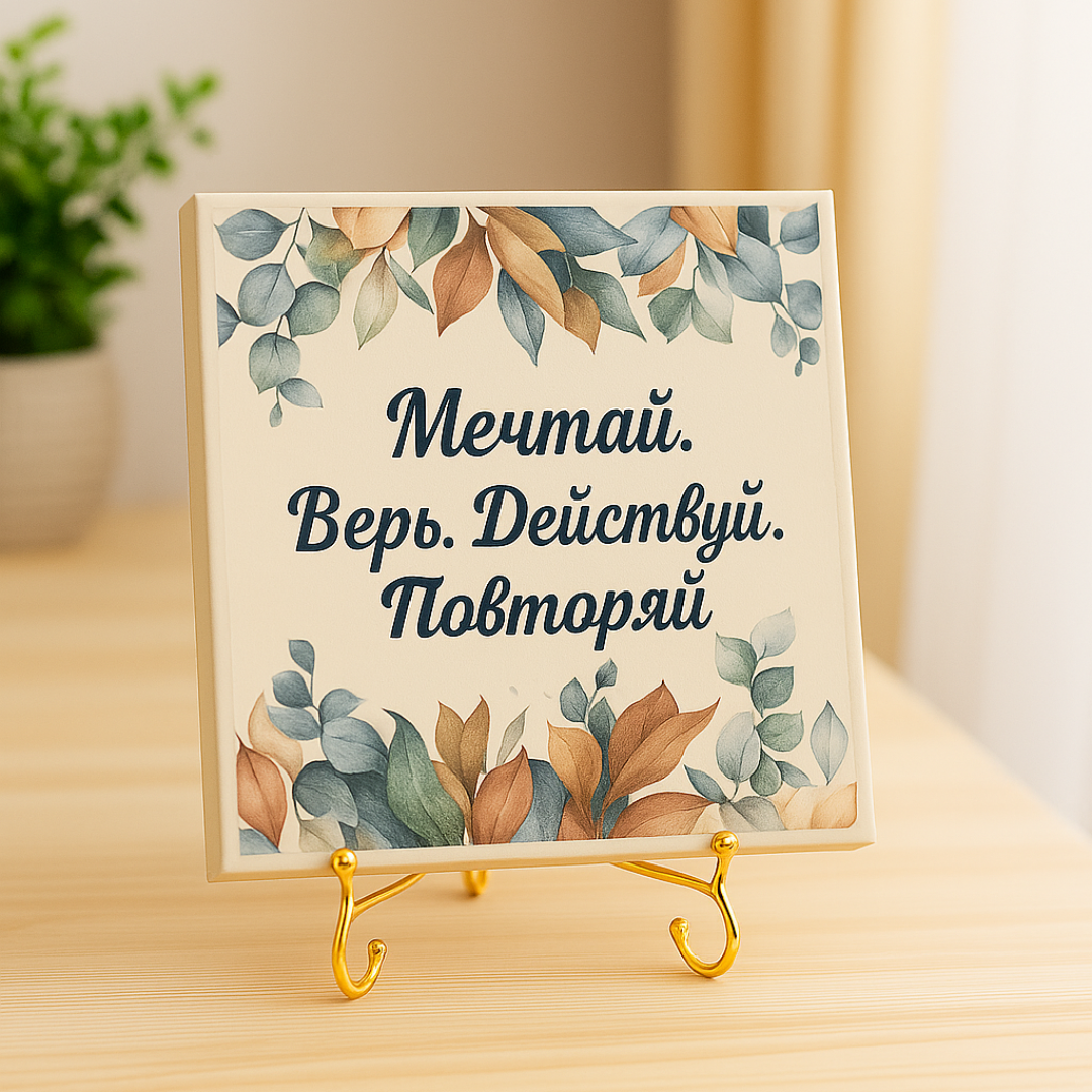Это не просто декоративный элемент, а настоящий источник мотивации и силы, который помогает не сбиваться с пути, напоминая, что каждое действие рождается из мечты и веры, а повторение этого цикла делает нас сильнее и мудрее. Плитка с такой надписью вдохновит вас и ваших близких на новые свершения и подарит уверенность в каждом дне.