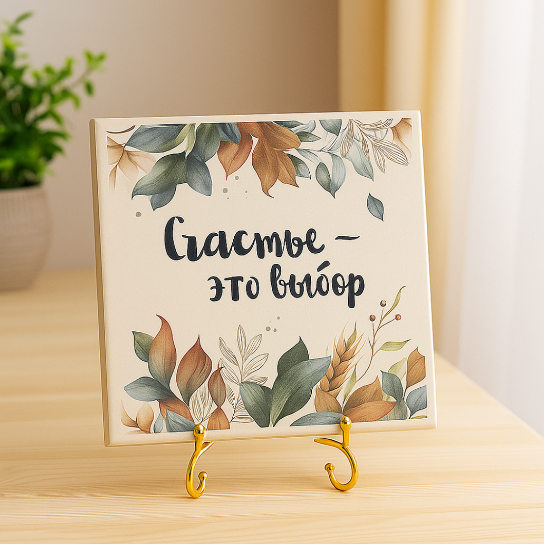 - Надпись «Счастье – это выбор» выполнена стильным шрифтом, подчёркивающим важность послания