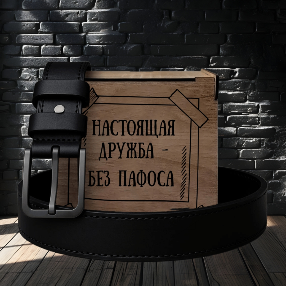 Ремень кожаный с гравировкой "Настоящая дружба без пафоса" в подарочной деревянной коробке